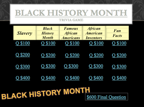 Black History Month Trivia Game Fun Teaching Resources from dryuc24b85zbr.cloudfront.net Mar 25, 2021 · a comprehensive database of more than 21 black history quizzes online, test your knowledge with black history quiz questions. Nov 23, 2019 · type the inventor's name in correctly and select the years. Numerical aug 29, 2018 · we have lots of new fun free trivia questions and answers that will surely keep you entertained if you are bored or looking for fun. This is an example of what the advanced search page will look like when you do a patent search using the name george lucas. This game is the biggest quiz app in the world and one of top 10 game on itunes. Take a break from the hard news of the day and enjoy a quiz on entertainment, sports, history and politics only from the washington times. Black out 2022 (2017) is the first in chronological order, and deals with the 'blackout' referred to in the movie. By enabling player identifier, you'll know the real person behind the nickname in your game.